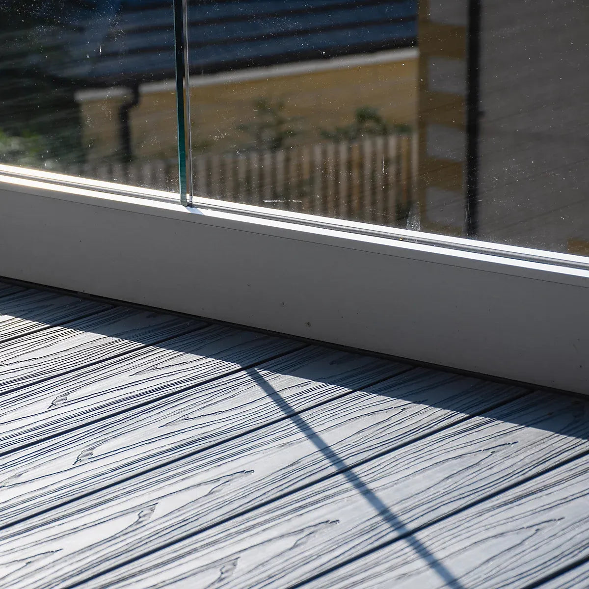 Grey Composite Decking Board, Habitat+ is reversible, one side has a woodgrain effect the other has a grooved finish. Use only the recommended Habitat fixings for installation (starter clips, hidden fixings and screws).