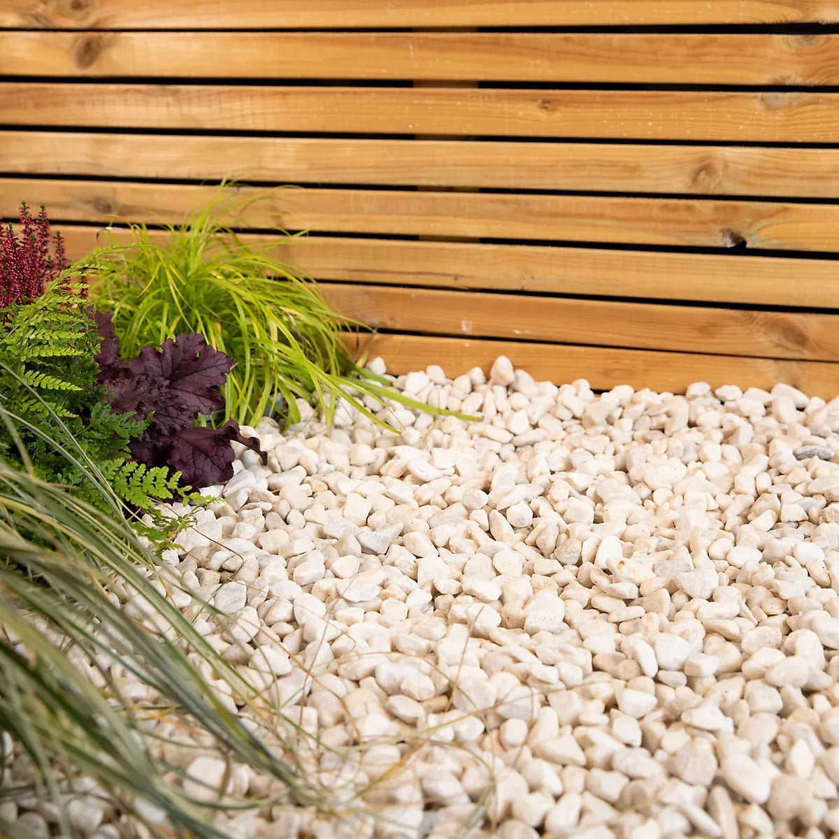 - Small white pebbles are perfect for use with mulch, borders and walkways