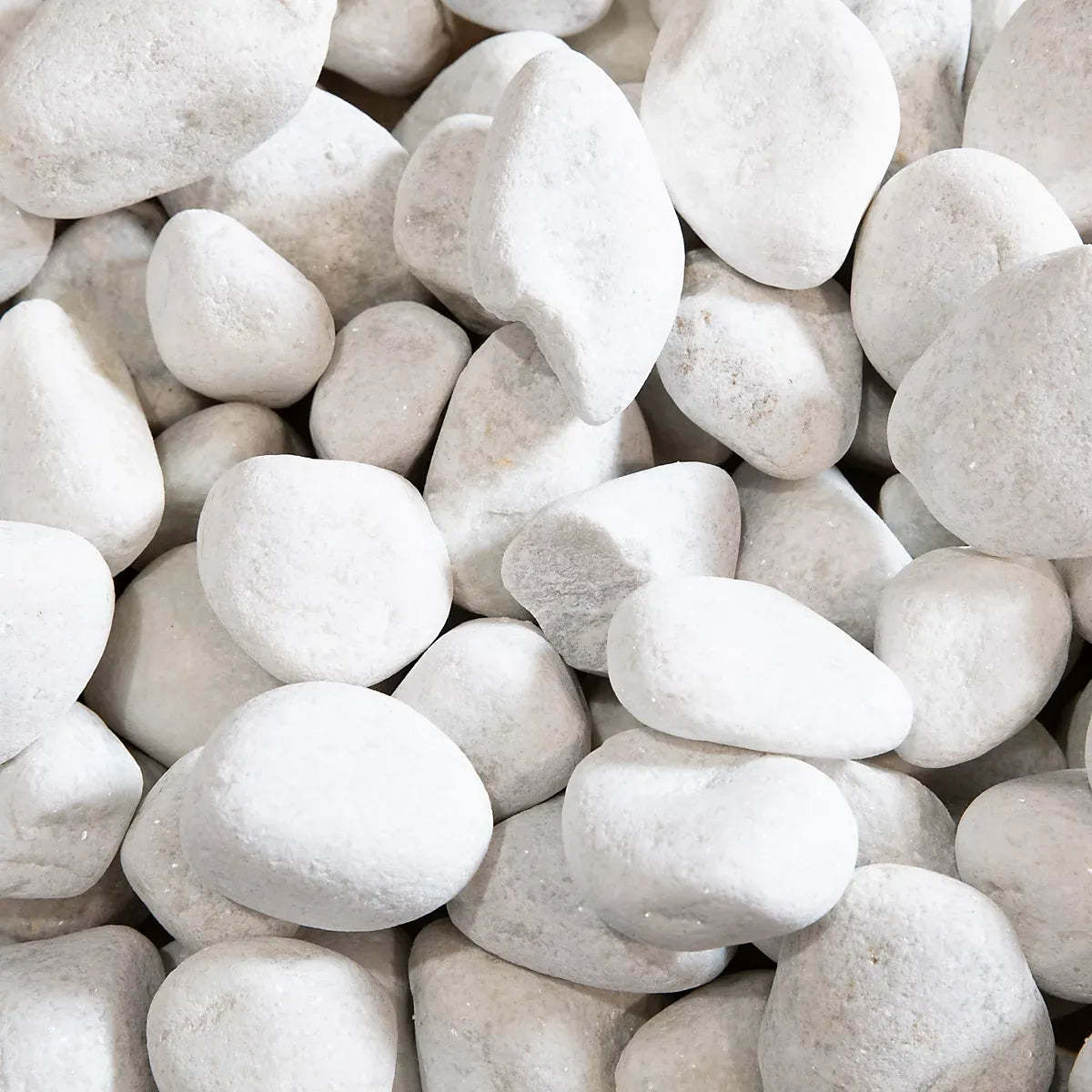 These large white marble pebbles offers a clean, bright finish for garden and landscaping projects. These large, white marble pebbles add visual appeal to water features, pathways, and decorative borders. Their smooth, naturally rounded surface provides a polished look, ideal for enhancing outdoor spaces.